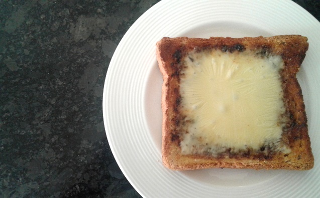トーストしたパンにバターぬりその上にベジマイトをぬり、スライスチーズをのせて、レンジで5秒~10秒、チンして出来上がり。ベジマイトは少量で、うすーくぬりましょう。レンジの代わりにオーブンで焼いてもOK