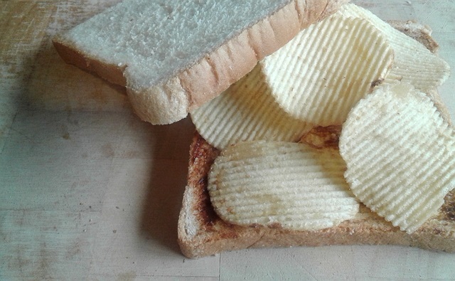 普通のパンにバターと、ベジマイトをぬり、そしてポテトチップスをのせて、もう一枚パンをのせて、そのまま食べます。