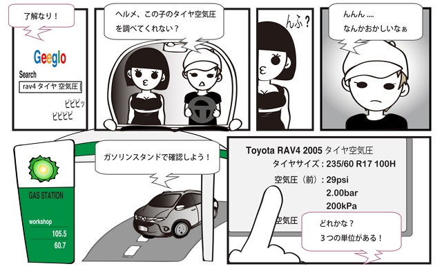 でした。(日本からの輸入車なので日本語の)取扱説明書には 200 kPa(キロパスカル)という単位で記載されていましたが、国によって圧力の単位が psi(ピーエスアイ、プサイ),bar(バール)と異なりますので、単位変換を行う必要があります。