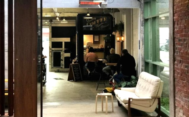 板張りのフロアにソファや椅子、テーブルが配置されたコードヤードでは、建物内で購入したコーヒーやスイーツを持ちこんで、ゆっくり過ごすことができます。
