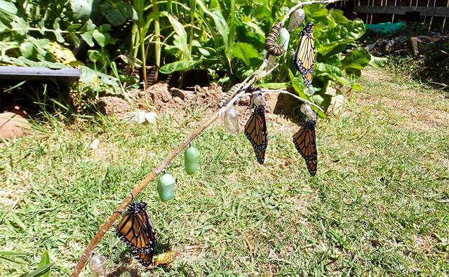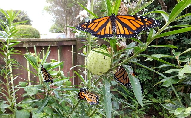モナークのメスは、約300〜500個の卵を産むと言われていますが、無事蝶々になって飛び立てるのは、 場所にもよりますが、そのうち平均約1〜2%だという研究結果が出ています。実はもう10年以上も前から、ミツバチ同様、世界的にモナークの個体数の大幅な減少が問題になっています。昨年末のNZの新聞記事でも、2018年は国内での個体数がさらに減少したとニュースになっていました。ほとんど見かけられなくなった場所もあり、たとえ見かけても、モナークのメスの中には卵を産む気配がないのもいて、過去50年にわたる観察記録の中では見られなかった現象だと報道がありました。花粉媒介者の数が減り続けると、私達人間が確保できる野菜や果物の数もどんどん減っていく可能性が高いので、この現象は私達にとっても決して無関心ではいられないのです。