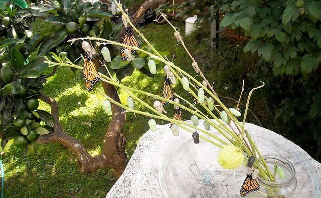 NZでは、モナークは、基本的にswan plantの葉っぱと茎と花だけを食べて育ちます(大きい幼虫なら、かぼちゃも少し食べられる様です)。幼虫は天敵のカマキリやスズメバチ、鳥に狙われやすいので、私の庭では、レースのカーテンで swan plantを覆ってみました。しかし、カマキリの侵入が防げないので幼虫を天敵から守るため、すくすく育っている幼虫を庭で見つけたら、swan plantの枝を少し切って、室内の花瓶にさして保護しています。