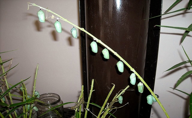 幼虫が幅約1cm、長さ約5cmに育つと、周辺にある枝や構造物を(時々壁や屋根も!)行ったり来たりして、 蛹が安定してぶら下がれる場所を探し始めます。不安定な場所は好まないようです。