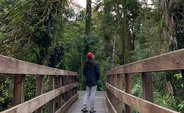 駐車場から軽いハイキングをしながら緑いっぱいの道や橋を通り、澄んだ森の空気のにおいを堪能しながら川に向かいます。