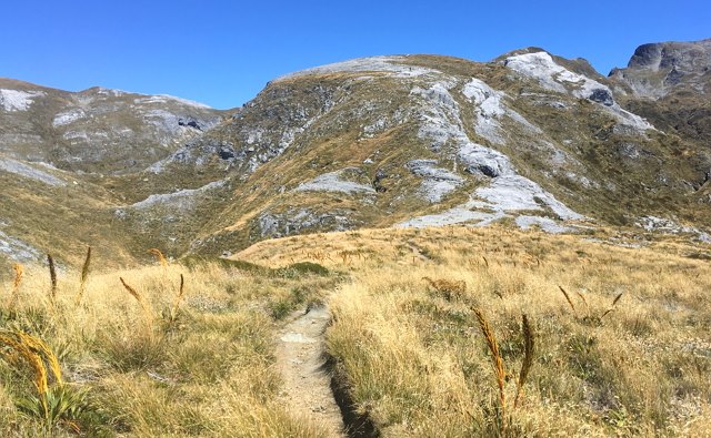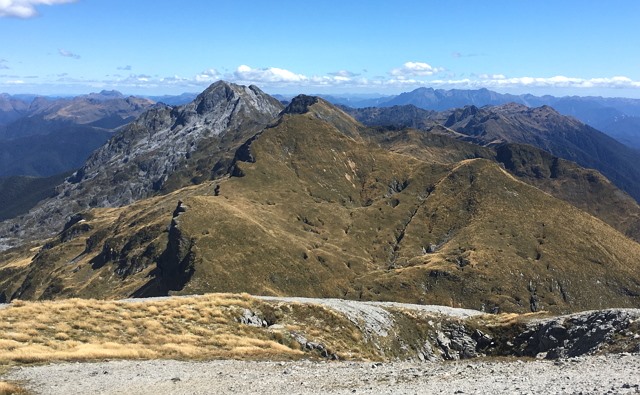 山の上にも関わらず南国チックな植物が生えている樹林帯、黄金に輝く草が揺れる美しい荒原、お花畑、山頂付近のゴツゴツした迫力ある岩場、遠くには青く透き通る tasman bay、そしてカフランギ国立公園の美しい山並み。