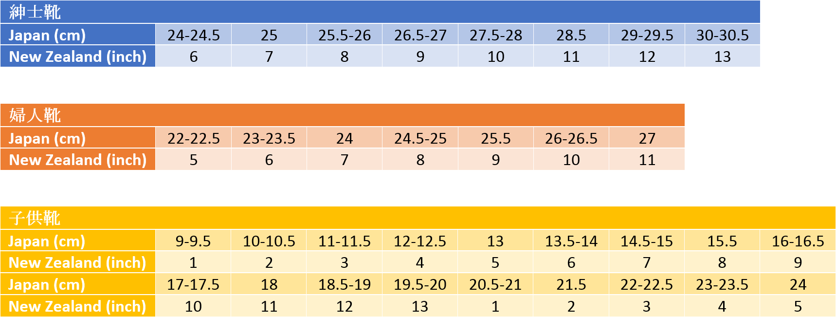 日本だと足裏の長さが基準なので、cmが合えば性別や大人子供に関係なく履くことができますが、ニュージーランドは少し違います。