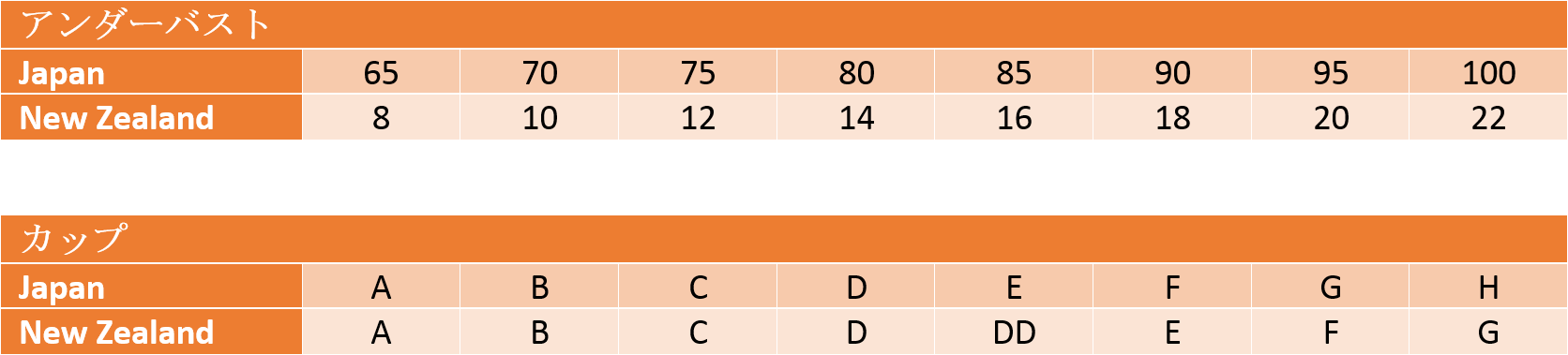 ブラジャーのサイズは、オーストラリアと同じ表記になります。
