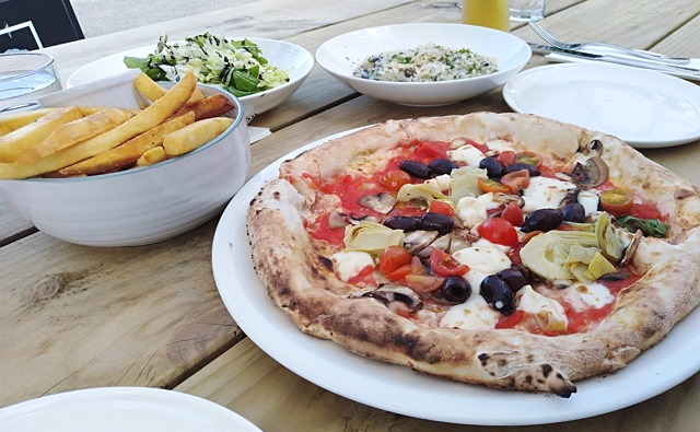 そこで食べたのは、モッツァレラチーズとトマト、アーティチョクのピザ、そしてホワイトソースとマッシュルームのリゾット、フライドポテトです。