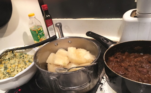 まずは凍ったキャッサバを鍋で茹でます。竹串がスッと通るくらい柔らかくなったら一旦完成で、塩を振ったり、付け合わせとしてそのまま食べてもいいです。